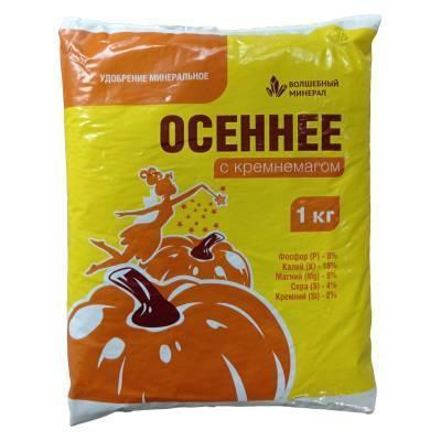 Удобрение минеральное смешанное Осеннее с кремнемагом. Применяется в качестве основного удобрения для всех видов овощных, плодово-ягодных, цветочно-декоративных культур, луковичных растений, газонных трав в осенний период, а также для подкормок в период вегетации. Удобрение с кремнемагом повышает плодородие почв, ускоряет развитие растений, увеличивает урожайность, улучшает качество плодов и овощей. Способствует устойчивости растений к заболеваниям и неблагоприятным погодным условиям.