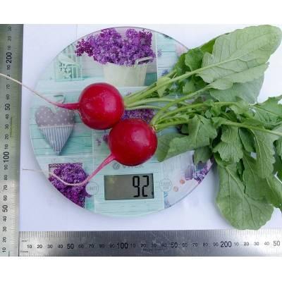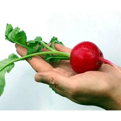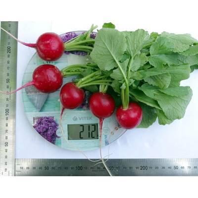 Гибрид раннеспелый. От всходов до потребления 23-25 дней. Корнеплоды очень выравненные по форме, массой около 30 г, необыкновенного вкуса без горечи, с нежным ароматом, сладковатые. Мякоть снежно-белого цвета, маслянистая, искрящаяся, нежного слабоострого вкуса, приятно хрустящая. Листовая розетка полураскидистая, упругая, очень маленькая; окраска черешков имеет сильно антоциановый цвет. Корнеплоды имеют округлую форму, аккуратный тонкий корешок, кончик которого белый, а сам корнеплод окрашен в малиново-розовый цвет. В любом возрасте редис не имеет пустот и не дряблеет, долго сохраняет свой товарный вид. Плотность посадки 200-220 растений/м2. Урожайность 5,0-6,0 кг/м2.
