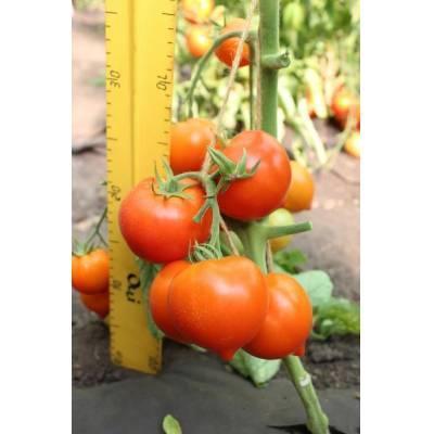 Раннеспелый детерминантный гибрид томата. От всходов до плодоношения проходит 95-100 дней. Растение компактное, среднеоблиственное, высотой 75-80 см. Первое соцветие закладывается над 5-6 листом, последующие – через 1-2 листа. В простых кистях формируется 6-7 округлых плодов с аккуратным носиком. Томаты темно-оранжевого цвета, плотные, гладкие, выравненные по форме и размеру, массой 110-120 г. Плоды мясистые, приятные на вкус, кисло-сладкие. Гибрид стрессо- и болезнеустойчивый. Плотность посадки – 4-5 растений/м2. Рекомендуем формировать растения в 3-4 стебля. Урожайность в открытом грунте – до 15,0 кг/м2, в защищенном – около 20,0 кг/м2.