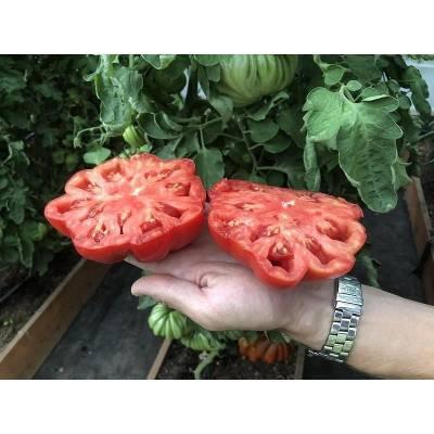 Среднеспелый полудетерминантный сорт томата. От всходов до плодоношения проходит 100-110 дней. Растение мощное, высотой до 180 см. Первое соцветие образуется над 9 листом, последующие - через каждые 3 листа. В полусложных и сложных кистях формируются необычные плоскоокруглые плоды с ярко выраженной ребристостью. Плоды крупные, массой 300-500 г, ярко-красной окраски, сочные, ароматные, с приятной кислинкой. Томаты идеально подходят для свежего потребления и переработки на сок. Сорт стрессо- и болезнеустойчивый. Плотность посадки – 4 растения/м2. Рекомендуем формировать растения в 1-2 стебля. Урожайность – свыше 20,0 кг/м2.
