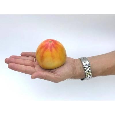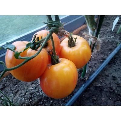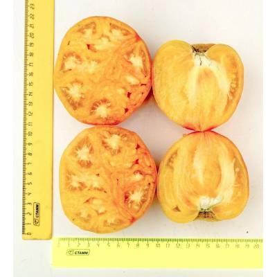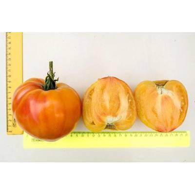 Раннеспелый индетерминантный гибрид томата. От всходов до плодоношения проходит около 95 дней. Первая кисть закладывается над 7-8 листом, последующие - через 3 листа. В простых и полусложных кистях формируется по 4-6 крупных плодов сердцевидной формы массой более 250 г. Томаты необычной жёлто-оранжевой окраски с малиновой «звездой» на вершине. Плоды салатного назначения, мясистые, многокамерные, сочные, ароматные, с высоким содержанием сахаров и фруктовыми нотками во вкусе. Гибрид стрессо- и болезнеустойчивый. Плотность посадки – 3-4 растения/м2. Рекомендуем формировать растения в 1-2 стебля. Урожайность – 18,0-20,0 кг/м2.