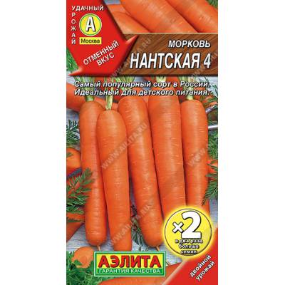 Популярный яркоокрашенный среднеспелый сорт. От всходов до технической спелости корнеплодов 100-110 дней. Корнеплоды сортотипа Берликум/Нантская, с гладкой поверхностью, средней длиной около 16-18 см, массой 85-205 г. Мякоть сочная, нежная, сладкая, с высоким уровнем каротина и сахаров. Сорт ценится за отличные товарные качества продукции – выровненность корнеплодов и отличный вкус. Рекомендуется для использования в свежем виде, замораживания и выращивания на пучковую продукцию. Урожайность 4-5 кг/м2.